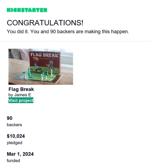 I bought the www.flagbreak.com URL (it was available and only $11/year), put together this website, and created a Kickstarter campaign (at www.kickstarter.com/projects/flagbreak/flag-break )